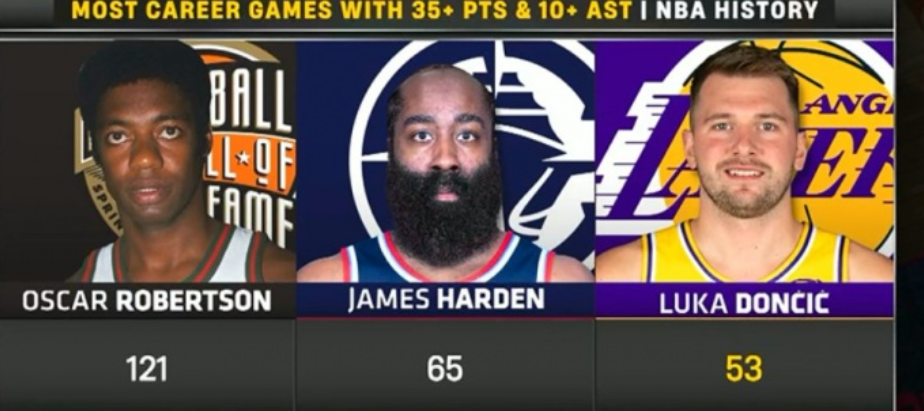 东契奇(26岁271天)成为湖人队史最年轻单场至少40分10助攻5三分的球员;东契奇生涯已53次至少35分10助,位列历史第三;东契奇湖人生涯7次40+,超越魔术师位列湖人队史第十;