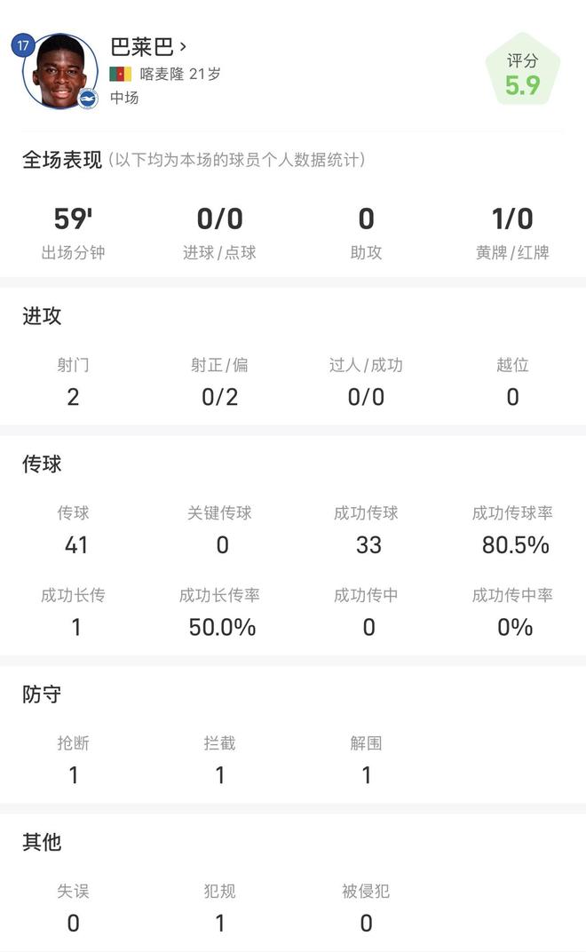 雷速体育10月26日讯 英超第九轮,布莱顿客场挑战曼联。本场比赛布莱顿后腰巴莱巴首发出战,但状态低迷,封堵意识和防守到位率都很低,在比赛第59分钟,被老将米尔纳换下。巴莱巴下场时,布莱顿已经0-2落后。